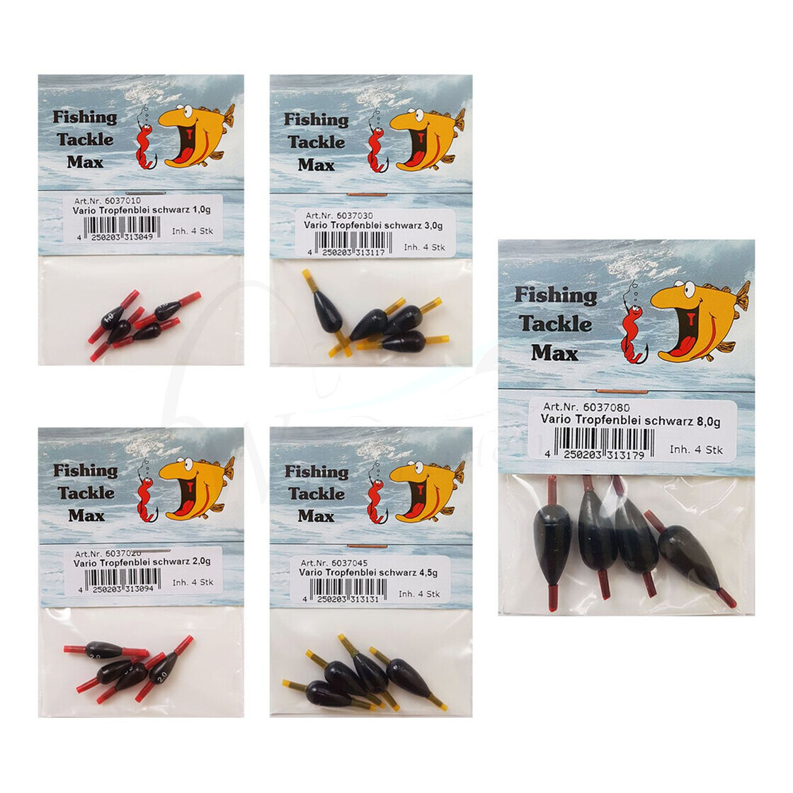 - Eine Packung mit vier Tropfenbleien in gewähltem Gewicht.