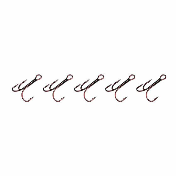 - Eine Packung mit fünf roten Drillingshaken in der Größe 2.
