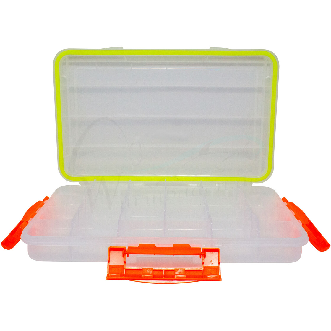Mit ihren großzügigen Maßen von 35,5 x 22 x 5,3 cm bietet die Box viel Platz, bleibt aber flach genug, um bequem in eine Angeltasche, einen Rucksack oder einen Gerätekoffer zu passen. Das auffällige orange-gelbe Design sorgt nicht nur für einen modernen Look, sondern hilft Ihnen auch, die Box schnell wiederzufinden – selbst bei schlechten Lichtverhältnissen.