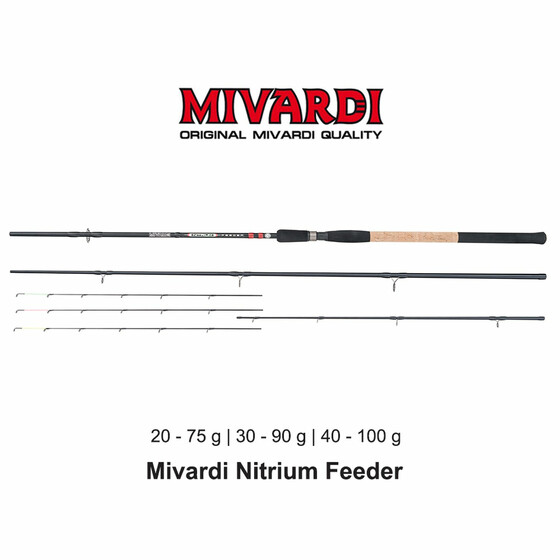 - Eine 3-teiilige Feederrute Mivardi Nitrium inkl. drei Spitzen in gewählter Ausführung.