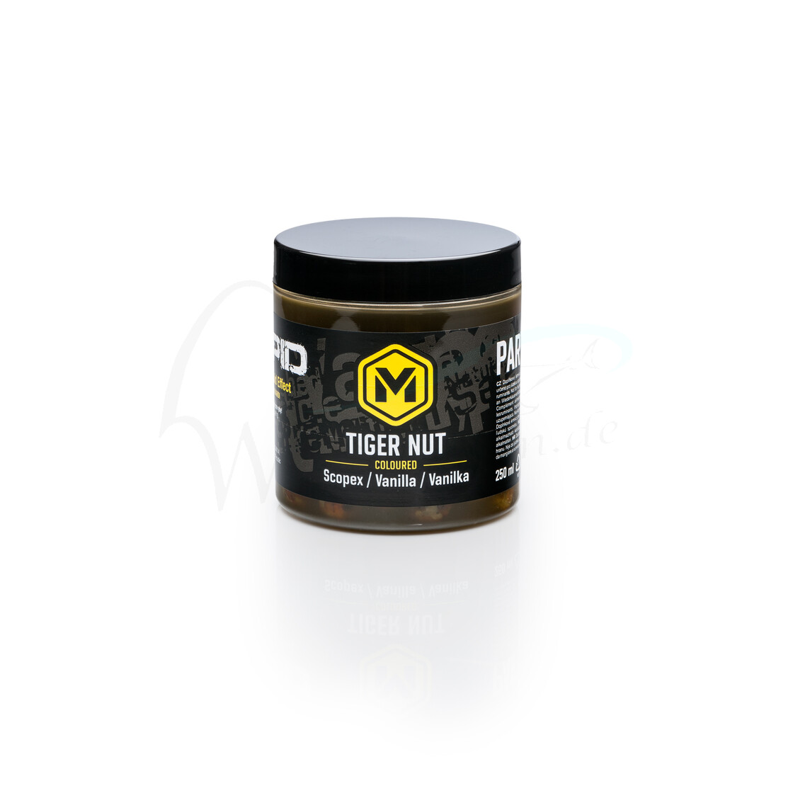 Durch die auffällige Färbung heben sich die Tigernüsse deutlich vom Gewässergrund ab und erzeugen zusätzliche visuelle Reize. In Kombination mit dem intensiven Scopex-/Vanille-Aroma entsteht ein unwiderstehlicher Köder, der auch vorsichtige oder erfahrene Karpfen zuverlässig zum Anbiss verleitet.